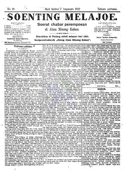 Surat kabar Soenting Melajoe diterbitkan pertama kali pada tanggal 10 Juli 1912. Surat kabar ini terbit tiga kali dalam seminggu dan tercatat dalam sejarah sebagai surat kabar perempuan pertama di Indonesia yang pemimpin redaksi, redaktur, dan penulisnya adalah perempuan.