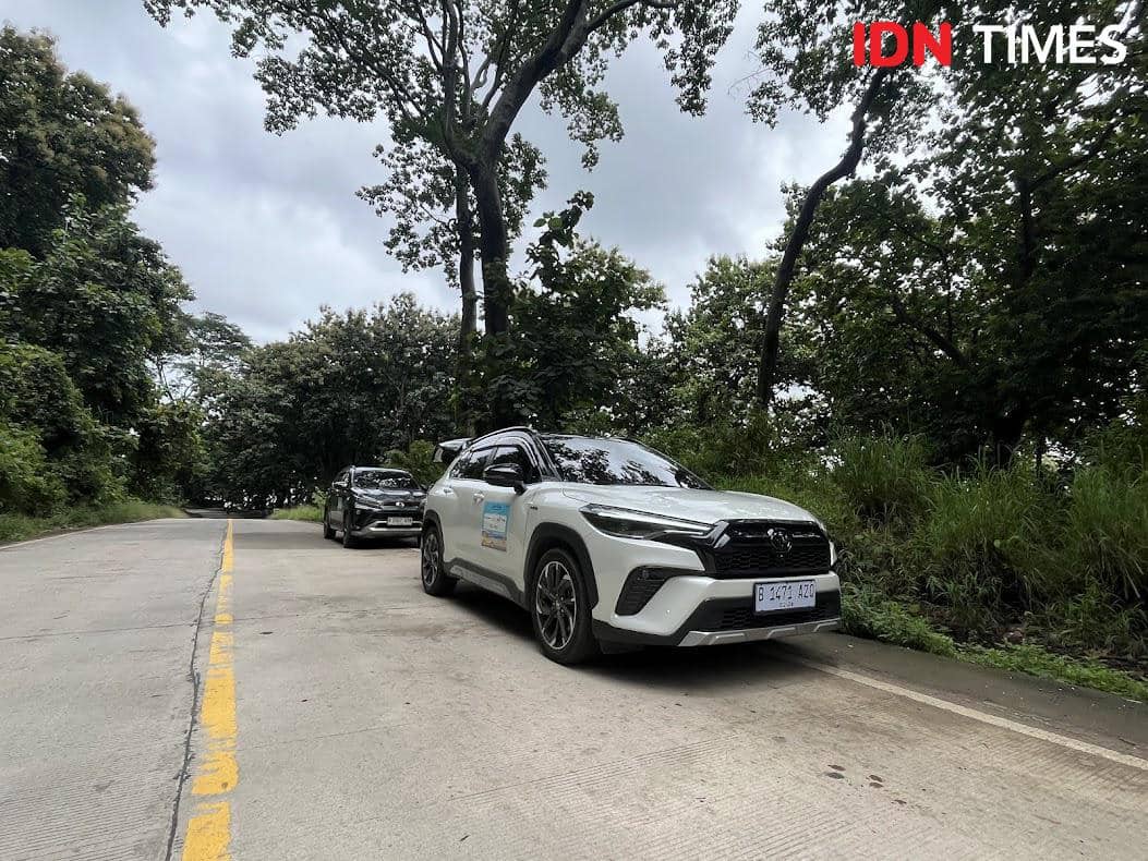 Mobil Toyota Corolla Cross Hybrid berwarna putih yang kami gunakan terlihat kontras sekali dengan suasana Alas Roban yang sendu dan hijau. Mesin hybridnya yang tenang membuat kami tetap bisa mendengar gemerisik dedaunan pohon jati yang ditiup angin.